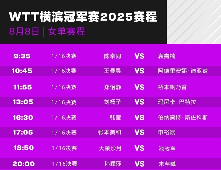 第一轮分为2个比赛日进行。孙颖莎的女单首轮,安排在8日最晚时间,北京时间20点进行。